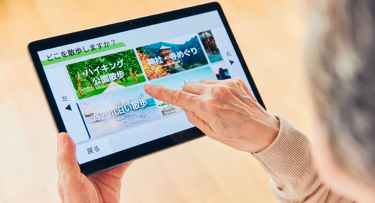 散歩場所は、富士登山道をはじめ、日本全国の観光地などを巡る、128コース(1コース 3~5分程度)からお選びいただけます。歩く人の動きを検知して、お散歩しているような目線の映像を再生。コースごとに音声ガイドや「励まし」があり、観光ツアーに参加しているかのようにお楽しみいただけるのが特長です。